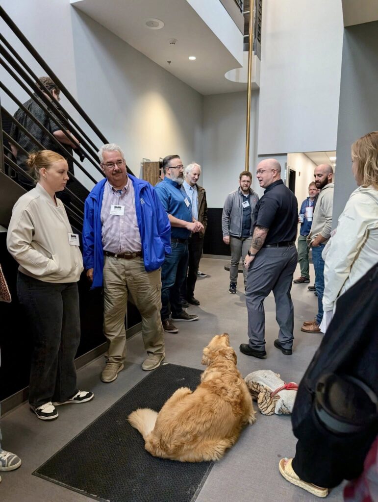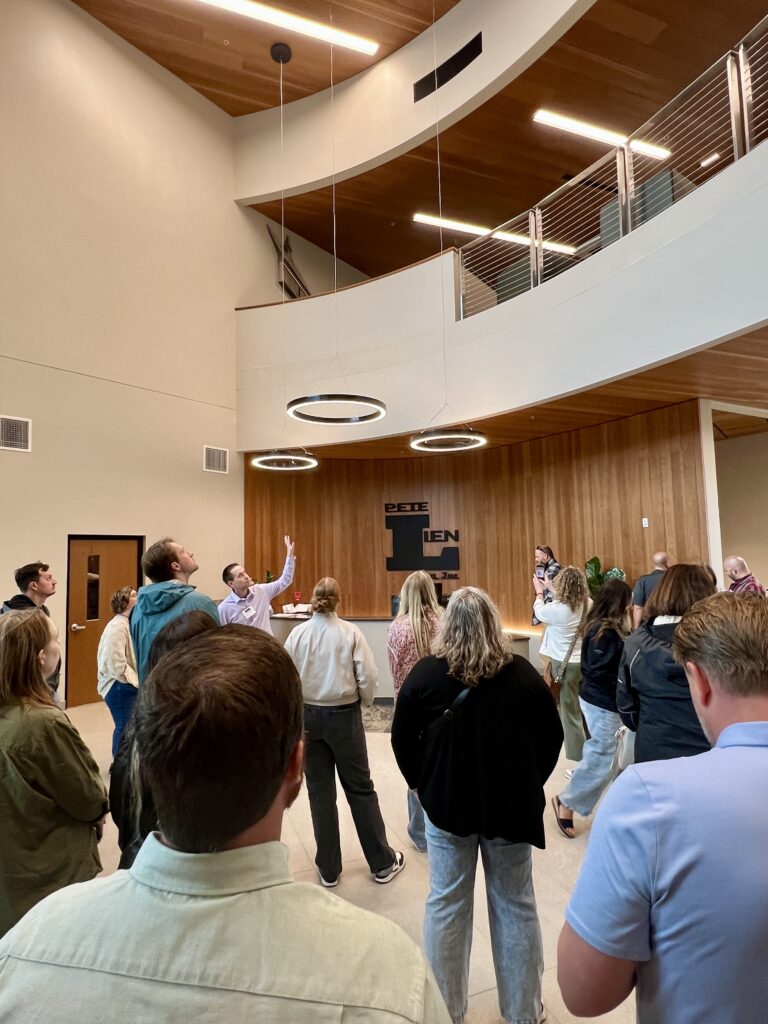 Pete Lien & Sons, Inc.’s all-new 42,156-square-foot headquarters stands on the site of its former office and overlooks one of the company’s original rock quarries. Architect-of-record Jared Pummel, AIA, president of Uda Architecture + Design, took fellow members through and around the building. Paved walkways already encircle the new structure, and employee use has inspired the company to plan additional trails. While on site, Design in the Hills tourists enjoyed a lunch provided by Pete Lien and Sons, Inc.