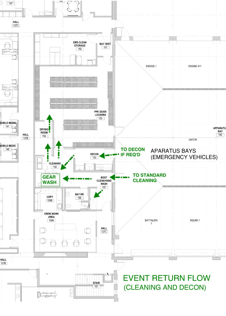 Firefighters returning to the station go immediately to a negative-pressure cleaning room or decontamination room, depending on the nature of the event. “There’s a process through that entire section of the building,” Burns says. “They wash off their boots, they remove the rest of their gear, they put it in special washing machines called extractors to get all off the soot off their clothing. The smoke and fire-debris particles that cling to their clothing can be carcinogenic, so we absolutely want to limit their exposure to that as much as possible inside the station.”