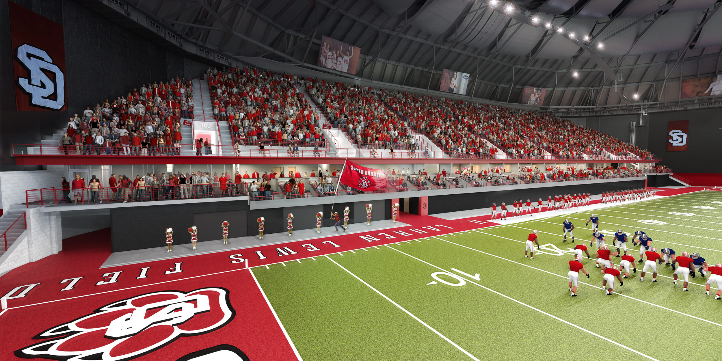 Studies have shown over and over again that the gameday experience is as important as the number of wins in the recordbooks, and so fandom was front-and-center in planning. New entrances, concessions, and a re-envisioned concourse were designed to make it easy to get in, get around, and get excited. For the first time ever, the DakotaDome will have a commercial kitchen, greatly expanding food options. A top-of-the-line sound system will totally change the gameplay for longtime fans, and all new field lighting brings the facility up to NCAA standards for the nearly DOUBLE fixed-seating capacity of the old facility. One of the biggest changes to the DakotaDome is the addition of 10 executive suites and 15 loge boxes with unobstructed views so close to the action that they are virtually unmatched in college football. VIP parking has been added for suite and season ticket holders.