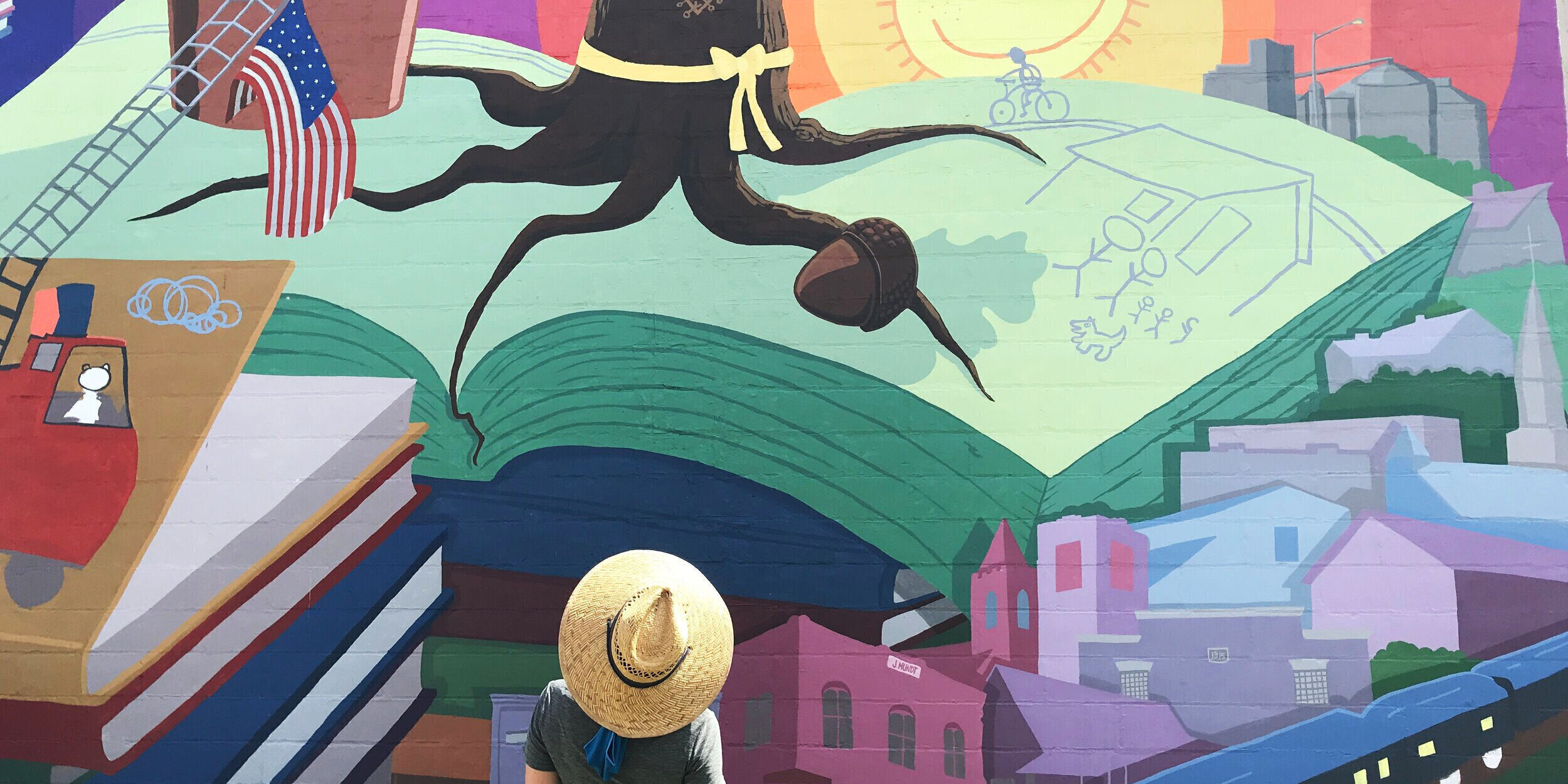 Murals. It seems that in the last decade we’ve started seeing more and more of them pop up all over the State. Down alleyways in big cities, on main streets in the smallest towns, murals have taken center stage in the world of public art. Maybe because it is so exciting to take a blank wall, lack-luster, deserving more and splash a mixture of creativity together with some paint to make a special place where people will take note. Many times, these creations standalone beautiful yet secretive. How did it get there? Who painted them and why? Well to answer that you would have to talk with the mural artists, someone like Amber Hansen.