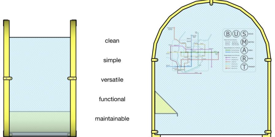 The conestoga bus shelter is intended to be a simple structure that is function and scalable. To achieve this, it was designed with interchangeable parts that can be easily recombined. Componentization offers the greatest capacity for scale and an affordable means for maintenance.