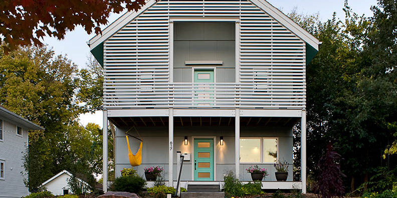 The design takes cues from the neighboring houses with a front porch facing the lower sidewalk with detached garage and alley access behind. The configuration allows for recreation and a patio adjacent to the kitchen in the space between house and garage. An ADA accessible ramp connects the garage to the back patio and main floor elevation. For the stacked front porch, W-flange steel columns add to the variety of columns seen on the street and contemporary slat detailing is used to screen views to the second level porch but frame views toward downtown. The house cladding reimagines horizontal clapboard in a durable, inexpensive panel system with custom flashings fabricated locally which emphasizes horizontal datum lines and alignments.
