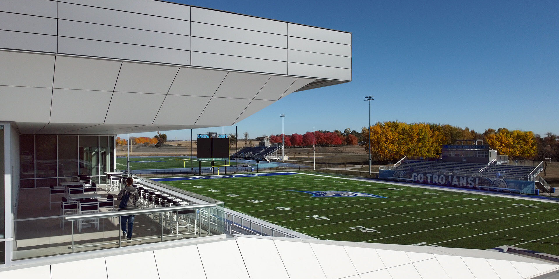 Adjacent to the Stadium is the Dan Beacom Track Complex—the first new DSU athletics facility since the Fieldhouse was finished in 1960. The Complex features a full-sized synthetic turf soccer field surrounded by a new eight-lane 400-meter polyurethane track in Trojan blue and new sites for shot put, discus, and javelin. New field lighting, grandstand seating, digital video displays, and press box amenities were provided for both outdoor complexes.