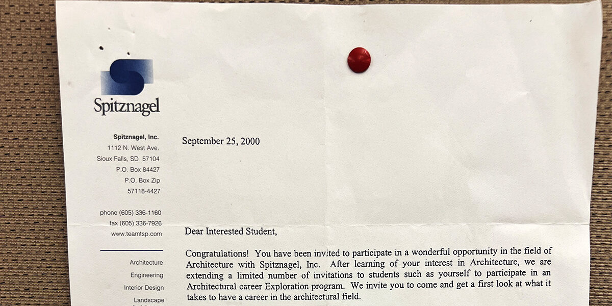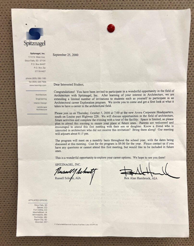 The letter came on Spitznagel letterhead and was signed by two folks: Russell Shultz, AIA, and Rex Alan Hambrock, AIA. Together, these two helped introduce a young group of high schoolers from around the city to the profession of architecture, took us on tours of some “amazing” projects of the time like Avera’s corporate headquarters or the new chalet at Great Bear (am I dating myself enough yet? … sheesh).